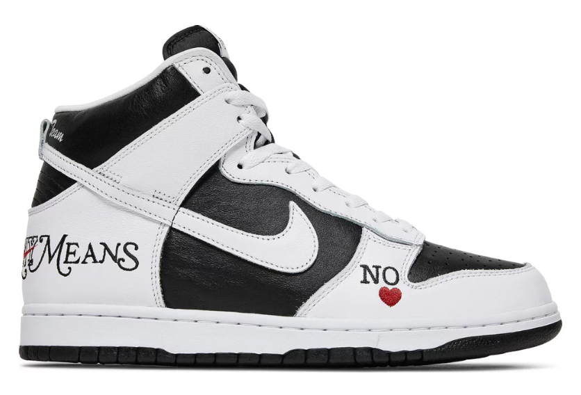 Nike Dunk x Supreme “By Any Means ” in a black and white colorway was released in the Spring/ Summer 22 season thanks to the collaboration between Nike and Supreme . Despite the huge popularity of the low-top version of the dunk , both brands decided to fill the niche of the High version. This beautiful edition decorated with embroidered lettering is made of high-quality leather.