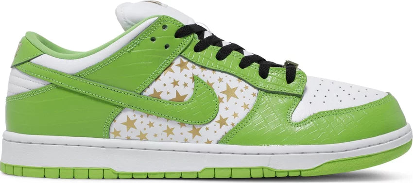 Nike SB Dunk Low Supreme Stars Mean Green are exclusive sneakers resulting from the prestigious collaboration between Nike and Supreme. The model features an upper made of "Mean Green" green leather, adorned with subtle golden stars that add a unique character. White details and green accents create a perfect contrast, highlighting the modern design. The interior of the shoe and the sole are designed with comfort in mind, making them ideal for both everyday wear and special occasions. This is a must-have for collectors and fans of limited editions.