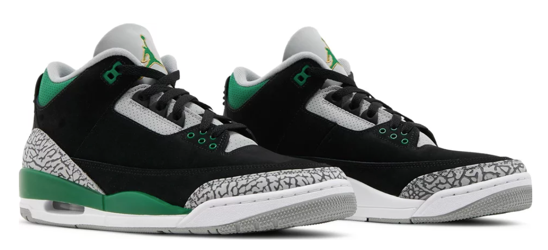 Air Jordan 3 w kolorystyce ”Pine Green” to kolejna edycja koszykarskich butów wydana oryginalnie w 1988 roku. Model ten znacząco różni się od 1 i 2 edycji, ale nadal zachował swój charakter. Buty te posiadają biało zieloną podeszwę i widoczny system Air. Cholewka składa się z czarnego zamszu oraz zielonych wstawek. Na pięcie znajduje się klasyczny swoosh w kolorze odpowiadającym detalom.