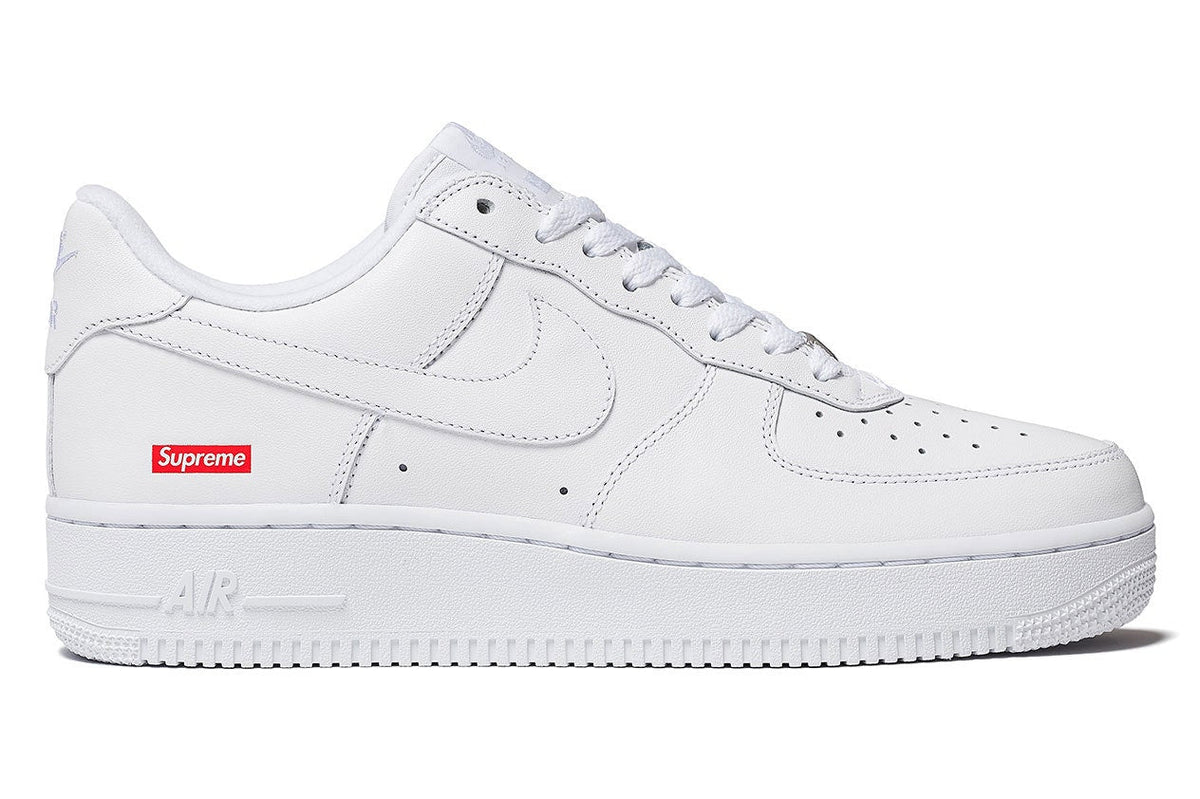 Air Force 1 Low w postaci premium, mają skórę lepszej jakości niż normalna ich wersja, posiadają logo supreme na zewnętrznej stronie kostki oraz sznurowadła z napisami "SUPREME" na całej ich długości.